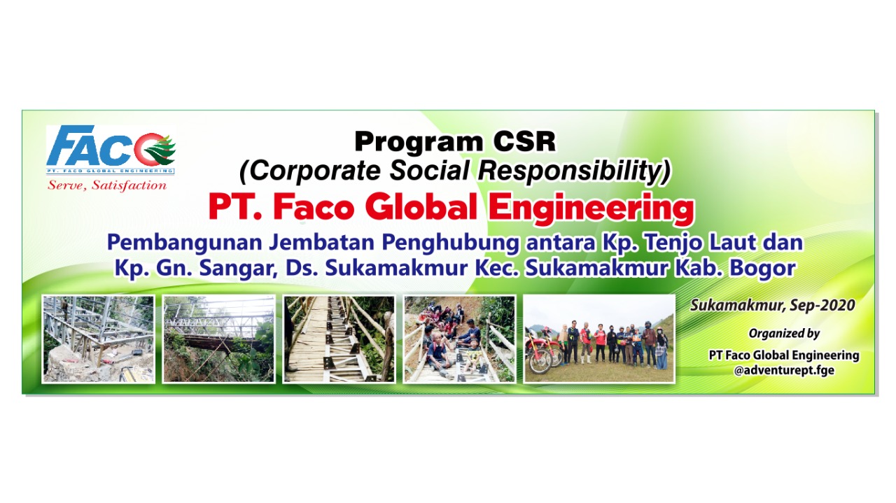 Sukamakmur-Bogor, - Direktur Utama PT. Faco Global Engineering Bapak H. Munarky yang kerap disapa Kiki menegaskan untuk ikut serta dalam pembangunan infrastruktur desa, salah satunya memperbaiki jembatan penghubung di desa sukamakmur, sebelumnya jembatan tersbut hanya dibangun diatas untaian bambu yang sempit hingga harus bergantian pada saat melintas, sekararang sudah dibangun jembatan dengan rangkaian baja yang lebih kuat dari sebelumnya dengan kerja sama antara warga desa dan tim PT. Faco Global Engineering.- Kp Tenjo Laut dan Kp. Gn. Sangar, Sukamakmur - Kab. Bogor/ 09-2020